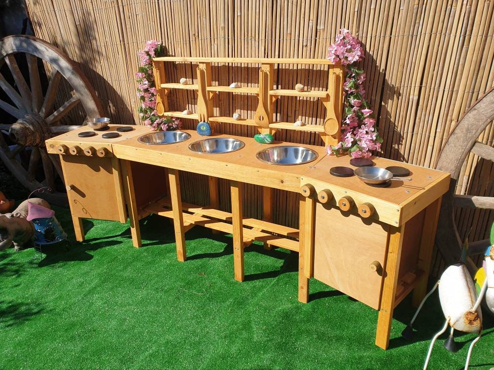 Large 3 bowl curve mud kitchen with 2 ovens. made in our small family home workshop using top quality building grade materials, treated for a long lasting outdoor toy for all your little ones and their soon to be jealous friends to enjoy.